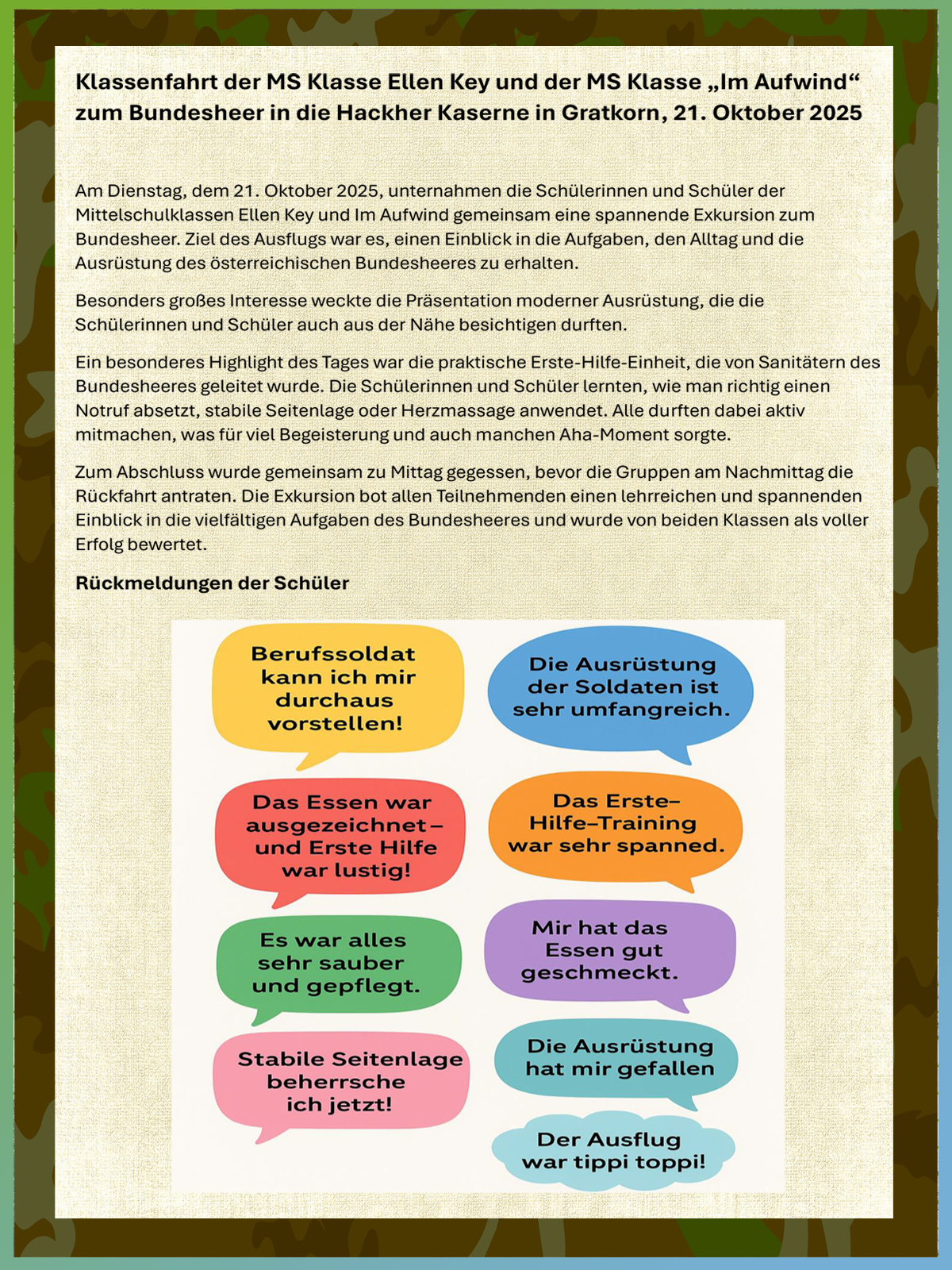 Die MS 2 und die Klasse am Aufwind unternahmen einen lehrreichen Ausflug zum Bundesheer in die Hackher Kaserne in Gratkorn. Hier ist ein ausführlicher Bericht samt Rückmeldungen der Schüler…